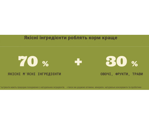 Склад: Свіжа курятина (22%), борошно з курки (21%), червона сочевиця, зелений горошок, свіжий лівер курчати (печінка, серце) (6%), борошно з оселедця (4%), яйця (4%), сира камбала (4%), риб’ячий жир (4%), нут, клітковина з горошку, крохмаль з гороху, борошно з індички (2,5%), зелена сочевиця, жовтий горошок, курячий жир (2%), сира печінка індички (0,5%), сіль, висушена ламінарія, свіжі яблука, мускатний гарбуз, свіжа морква, свіжі груші, гарбуз, свіжі цукіні, капуста Кале, шпинат, свіжа зелень ріпи, зелень буряка, свіжа чорниця, свіжа цільна журавлина, свіжі ягоди ірги, корінь лопуха, лаванда, корінь алтеї, розторопша, плоди шипшини, куркума.