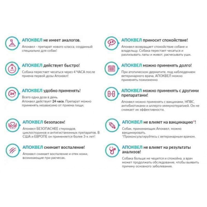 - Противопоказанием к применению Апоквела является индивидуальная непереносимость животным его компонентов. Не допускается применение препарата собакам, с признаками иммуносупрессии, такими как гиперадренокортицизм, а также собакам, с прогрессирующими злокачественными новообразованиями. Не следует применять препарат кобелям в период вязки, собакам моложе 12-месячного возраста и/или массой менее 3 кг, а также щенным и кормящим сукам.