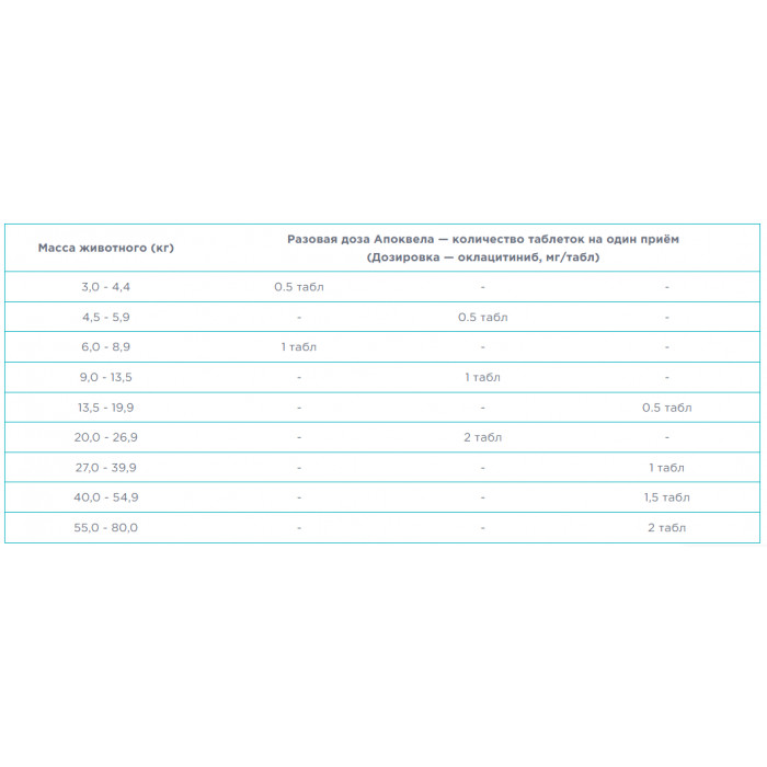 Следует убедиться в том, что собака полностью проглотила необходимую дозу препарата. Прием корма на биодоступность оклацитиниба не влияет.Дозы Апоквела в зависимости от массы животного и используемой дозировки представлены в таблице.