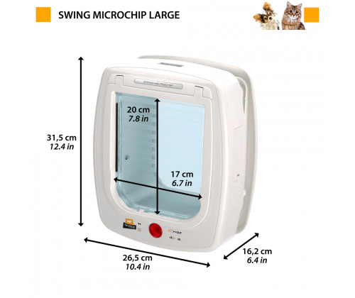 - Габаритные размеры дверки Swing Microchip Large: 26,5 x 16,2 x 31,5 см