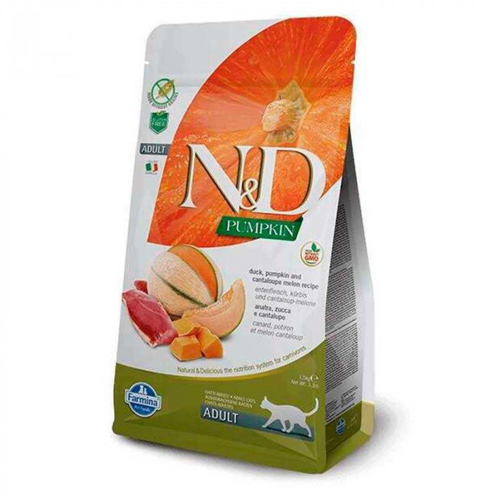 Farmina (Фармина) N&D Grain Free Pumpkin Adult Cat Утка Тыква сухой беззерновой корм для котов - полнорационный беззерновой сухой корм с уткой, тыквой и дыней канталуп для взрослых кошек всех пород. Комбинация отборных ингредиентов и витаминно-минеральный баланс способствуют поддержанию активности, хорошего самочувствия и общего здоровья любимца.