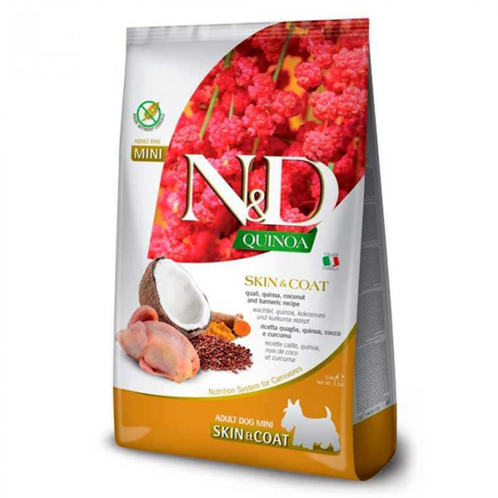 Farmina N&D Quinoa Skin & Coat Adult Mini Quail & Сoconut - полнорационный беззерновой диетический корм со вкусным мясом перепелки, полезными киноа, кокосом и куркумой для взрослых собак мини и мелких пород.