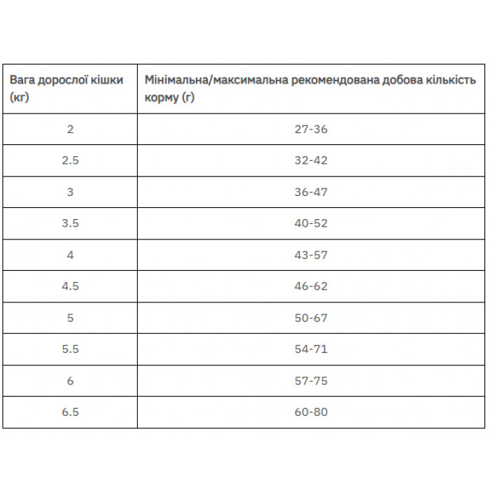 Питательные вещества: 31,00% сырой протеин; сырой жир 11,00%; сырая клетчатка 6,50%; влага 8,00%; сырая зола 8,20%; кальций 1,10%; фосфор 0,90%; магний 0,09%; Омега-6 2,00%; Омега-3 0,40%; DHA 0,15%; EPA 0,10%; таурин 0,18%.