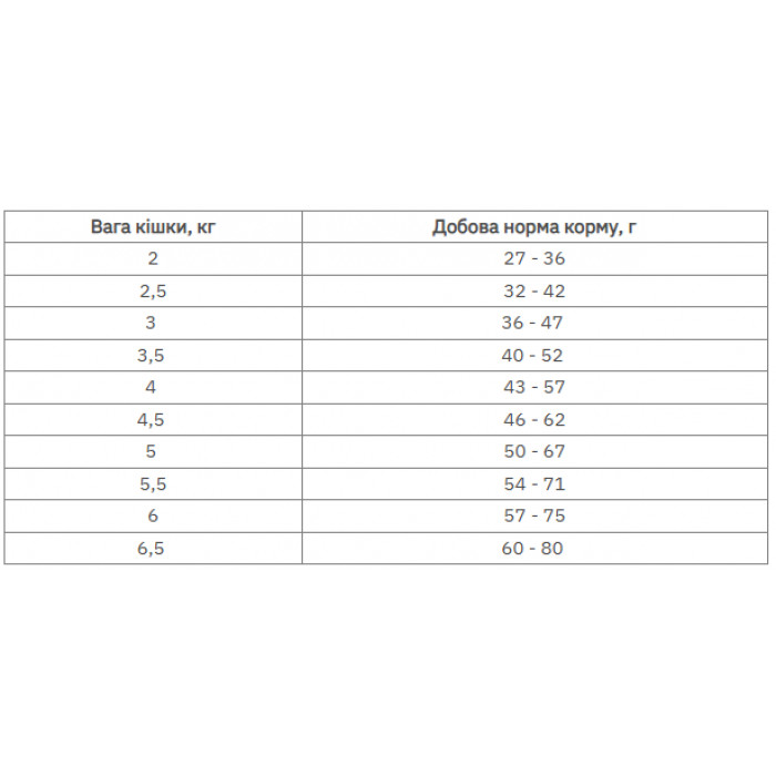 Сырой белок 31,00%; сырой жир 11,00%; сырая клетчатка 6,50%; влага 8,00%; сырая зола 8,50%; кальций 1,10%; фосфор 0,90%; магний 0,09%; Омега-6 2,00%; Омега-3 0,40%; DHA 0,15%; EPA 0,10%; таурин 0,18%.