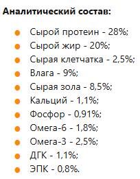 Основным ингредиентом является сибас (морской окунь) - рыба, богатая белком и незаменимыми жирными кислотами, являющийся чистым и легкоусвояемым источником энергии.