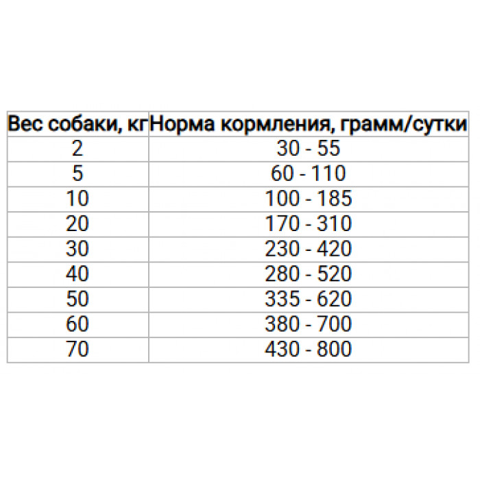- Суточная норма кормления, приведенная в таблице на упаковке, является ориентировочной и может быть скорректирована в соответствии с породой, окружающей средой, темпераментом, физической активностью и состоянием собаки