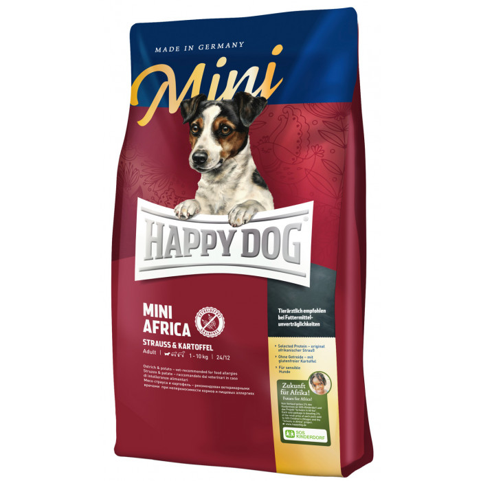 Happy Dog Mini Africa (Хеппі Дог Міні Африка) сухий кормдля собак дрібних порід при алергіях та харчовій непереносимості зі страусом та картопляними пластівцями (без злаків) - повнораціонний корм для усіх дорослих собак вагою до 10 кг з нормальною потребою в енергії. Надзвичайно смачний повнораціонний корм класу супер-преміум Happy Dog Africa -ідеальний для усіх собак, які віддають перевагу нестандартному корму або дуже розбірливі у їжі. Для собак дрібних порід з чутливим травленням, так як у цьому кормі враховано їх особливі потреби: унікальна формула корму Happy Dog Africa містить м'ясо страуса та картоплю. М'ясо страуса є джерелом рідкісного білку - для собак, які страждають на харчову непереносимість. Картопля не містить глютену, тому рекомендована для собак, які мають алергію на злаки. Ексклюзивну рецептуру доповнюють цінні жирні кислоти Омега-3 та Омега-6, які гарантують собаці здорову шкіру та блискучу шерсть.