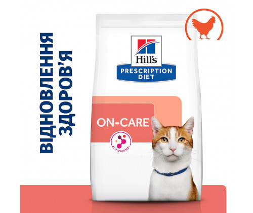Hills Prescription Diet Feline ON-Care (Хиллс Он Кеа Курица) корм для котов страдающих тяжелыми заболеваниями - полнорационное диетическое питание, специально разработанное диетологами и ветеринарными врачами для восстановления потребления пищи в период реабилитации. Содержит все питательные вещества, необходимые вашему коту. Подходит для длительного кормления кошек, страдающих тяжелыми заболеваниями, в частности раком.