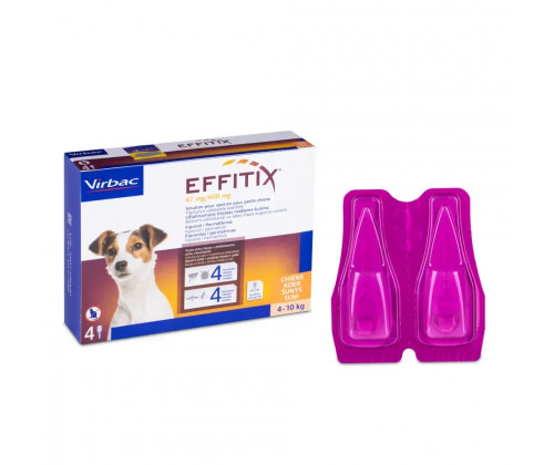 Капли для собак 4-10 кг от блох и клещей Virbac Effitix (Вирбак Еффитикс) 67/600 мг 4 пипетки - инсектоакарицидный препарат в виде капель для местного применения, который применяется для профилактики и уничтожения блох и клещей, паразитирующих на собаках. Обладает репеллентными свойствами, отпугивает и уничтожает комаров и слепней в течение 4 недель.