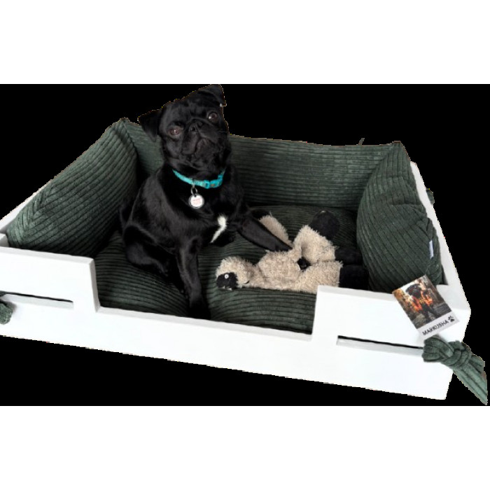 Cшита из мягкой приятной мебельной ткани. Каркас изготовлен из натурального дерева и покрытый краской на водной основе. Лежанка проста в уходе. Чехол легко снимается, его можно стирать в стиральной машине при температуре 30°С в режиме "деликатная стирка".