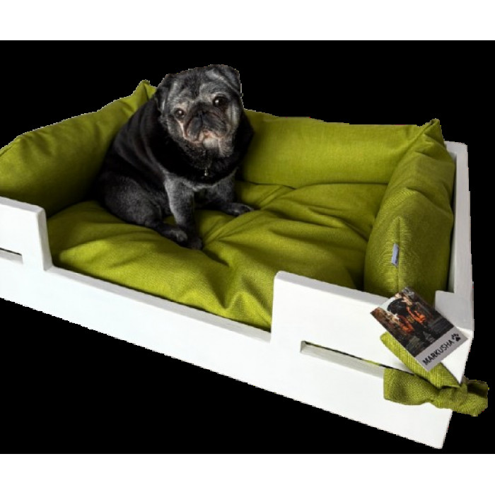 Cшита из мягкой приятной мебельной ткани. Каркас изготовлен из натурального дерева и покрытый краской на водной основе. Лежанка проста в уходе. Чехол легко снимается, его можно стирать в стиральной машине при температуре 30°С в режиме "деликатная стирка".
