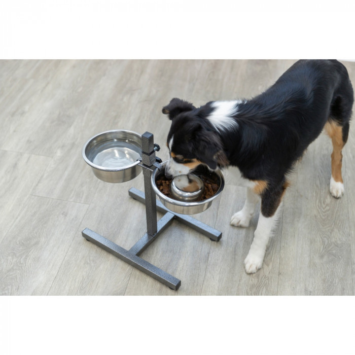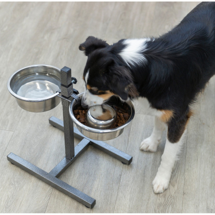 Миски на подставке для собак и кошек Trixie (Трикси) h:40 см 2х1.8 л d:21 см - стильная и прочная подставка с двумя мисками идеально подходит для любой породы, благодаря возможности регулировки высоты. Это способствует правильной осанке во время еды и уменьшает нагрузку на шею и суставы, что особенно важно для собак, склонных к проблемам с пищеварением или суставами.