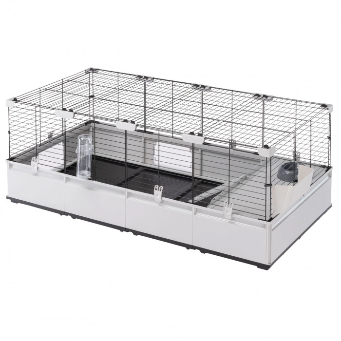 Жилая площадь модели Modular 3 составляет 1,03 кв. м. Она идеально подходит для размещения милых кроликов или нескольких морских свинок с максимальным комфортом. Эта модель поставляется в комплекте с такими аксессуарами, как поилка, миска для корма, кормушка для сена и большое гнездо с лестницей, и совместима со всеми дополнительными модулями и аксессуарами из серии Modular.