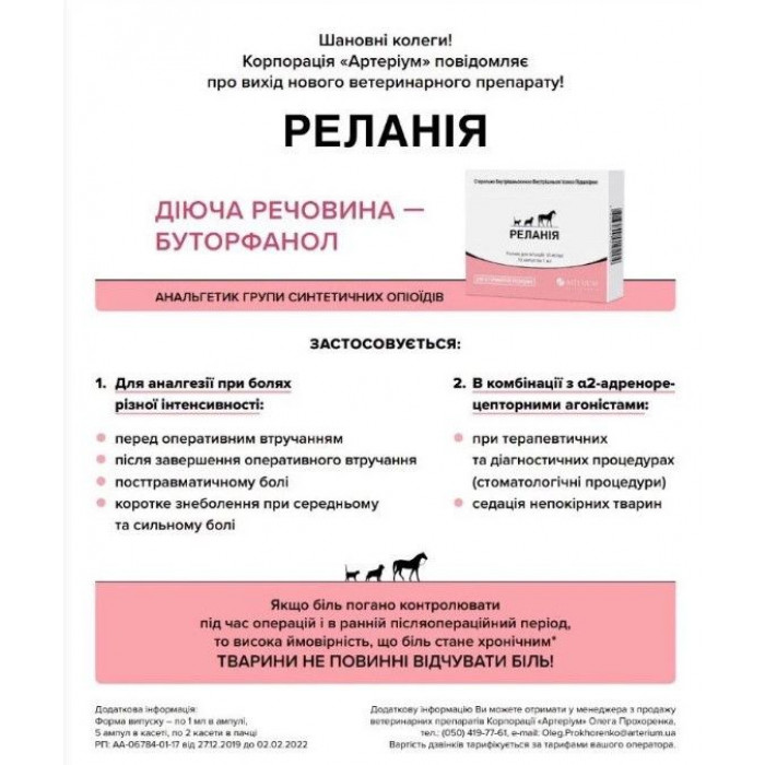 Уникальность препарата в его действующем веществе. Буторфанол – это один из наиболее сильных анальгетиков, которые используют в ветеринарной практике. На сегодняшний день официально в Украине Релания является единственным ветеринарным препаратом с таким действующим веществом. Релания применяется для устранения острой боли разной интенсивности.