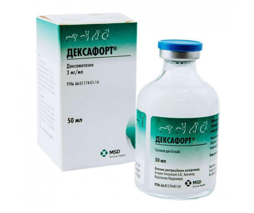 Противовоспалительный ветпрепарат для животных Dexafort MSD Animal Health (Дексафорт) 50 мл - лечение крупного рогатого скота, лошадей, свиней, собак и кошек, больных артритами, бурситами, тендовагинитами, аллергическими дерматитами, первичными кетозами, ацетонемией, маститами, агалактией, экземой, а также при родовом парезе.
