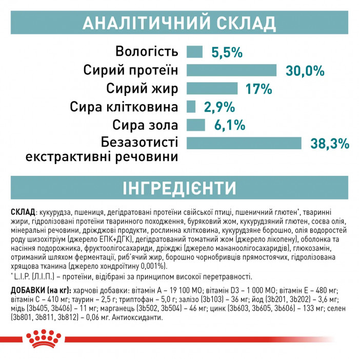 Кукуруза, пшеница, дегидратированные протеины домашней птицы, пшеничный глютен*, животные жиры, гидролизованные протеины животного происхождения, свекликовый жем, кукурузный глютен, соевое масло, минеральные вещества, дрожжевые продукты, растительная клетчатка, кукурузная мука, масло водорослей рода шизохитриум (источник ЭПК+ДГК), дегидратированный томатный жом (источник ликопена), оболочка и семена подорожника, фруктоолигосахариды, дрожжи (источник мананолигосахариды), глюкозамин, полученный путем ферментации, рыбий жир, мука бархатцев прямостоячими, гидролизованная хрящевая ткань (источник хондроитина 0.001%).