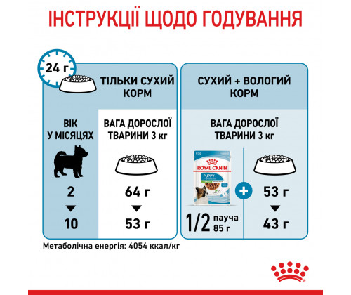 Удовлетворяет энергетические потребности щенков собак очень мелких размеров в период роста и обладает высокой вкусовой привлекательностью.