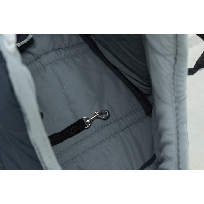 Имеет вшитый короткий поводок, чтобы любимец не надумал путешествовать без вас.